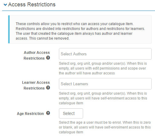 Learner restrictions limit who can self-enrol in Catalogue Items. These restrictions do not limit an administrator who has author access from assigning enrolment to a user.
