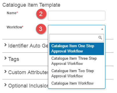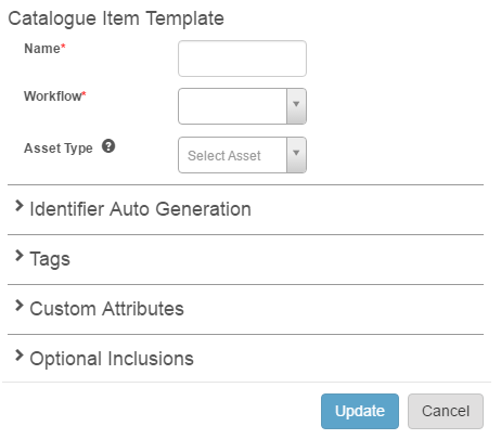 This section provides you with the option to specify a format for your Catalogue Item identifier. When Catalogue Items are created using this template, the Identifier will be automatically populated.