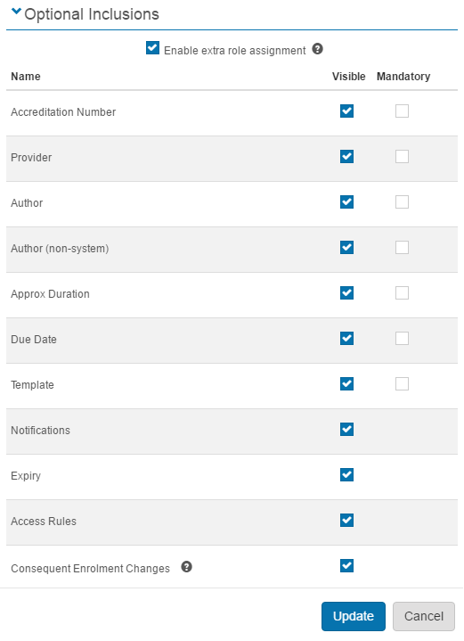 This other items in this section give you the option to hide items or make them visible on the Catalogue Item. Some of the fields have a Mandatory checkbox. If any of these are selected, it will not be possible for the author to save the Catalogue Item without populating them.