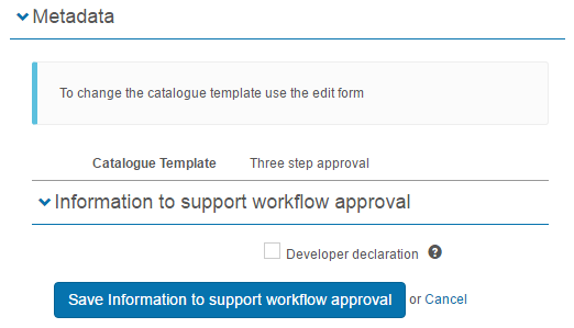 When a custom attribute is selected in the template, a new section, Information to support workflow approval, will appear in the metadata section of the Catalogue item.