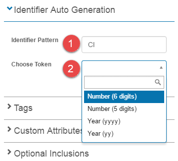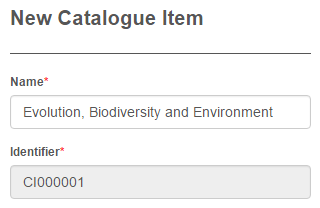 In the example below, on creation of a new Catalogue Item, the Identifier field has been auto populated based on an identifier pattern of CI and a token of Number (6 digits).