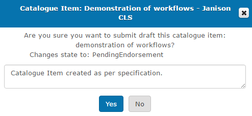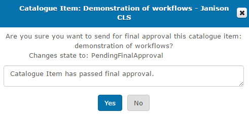 - A confirmation popup is displayed and lists the state that the Catalogue item will change to.