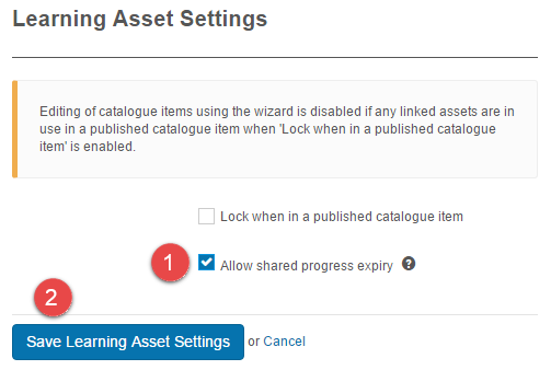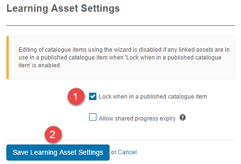 This setting allows an administrator to prevent learning assets from being edited when they are in a Catalogue Item with a status of Public (Available in Catalogue) or Private (Not in Catalogue).