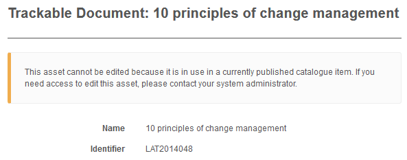 When an admin user opens a learning asset linked to a Catalogue Item with a status of Public or Private, they will not see an edit button. They will be provided with feedback explaining why the asset cannot be edited.