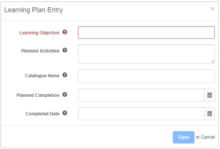 In Learning Plan Entries the learner details a number of specific objectives that they would like to accomplish. Each entry has a number of parts: