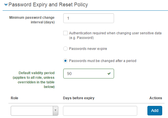 You can make a User’s password expire after a certain number of days or set the password to never expire. You can also change the number of days Users must wait before they can change their passwords. In addition, the Password expiry time can be configured differently per Role.