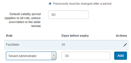 Enter a value in the Default validity period field to specify when the system will force a password reset for Users. This expiry period can be customised for particular roles using the Role drop-down as shown in the screenshot above. In this example the Facilitator role has been set to expire after 30 days. All other User passwords will expire in 90 days.