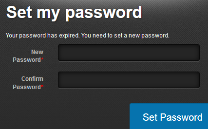 Below is the screen a User will encounter when their password expires. The text Your password has expired. You need to set a new password is a String Resource and can be customised if required.