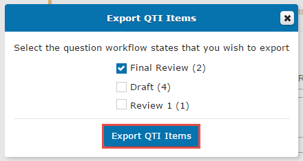 A pop-up text box lists the numbers of QTI Questions in the Module, divided into categories based on workflow states. Click the checkbox(es) to export the Questions in the desired workflow states.