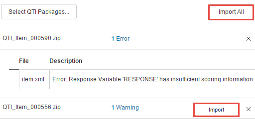 After validation, you can import each package individually by clicking the Import button, or use the Import All button to import all packages that do not have errors. In the example below, only one of the two question packages is error–free so the two buttons will achieve the same result.