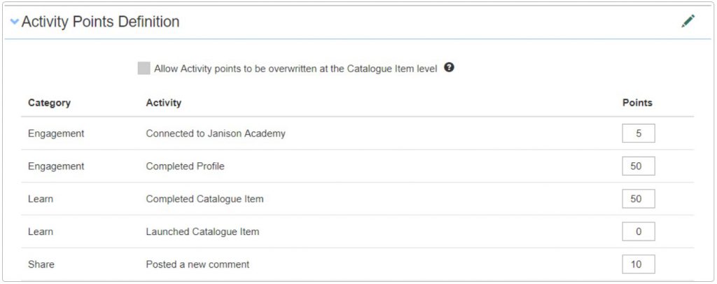 Activity Points Definition page allows you to configure the points allocated to users for performing certain actions e.g. completing content. submitting Add and Share etc.