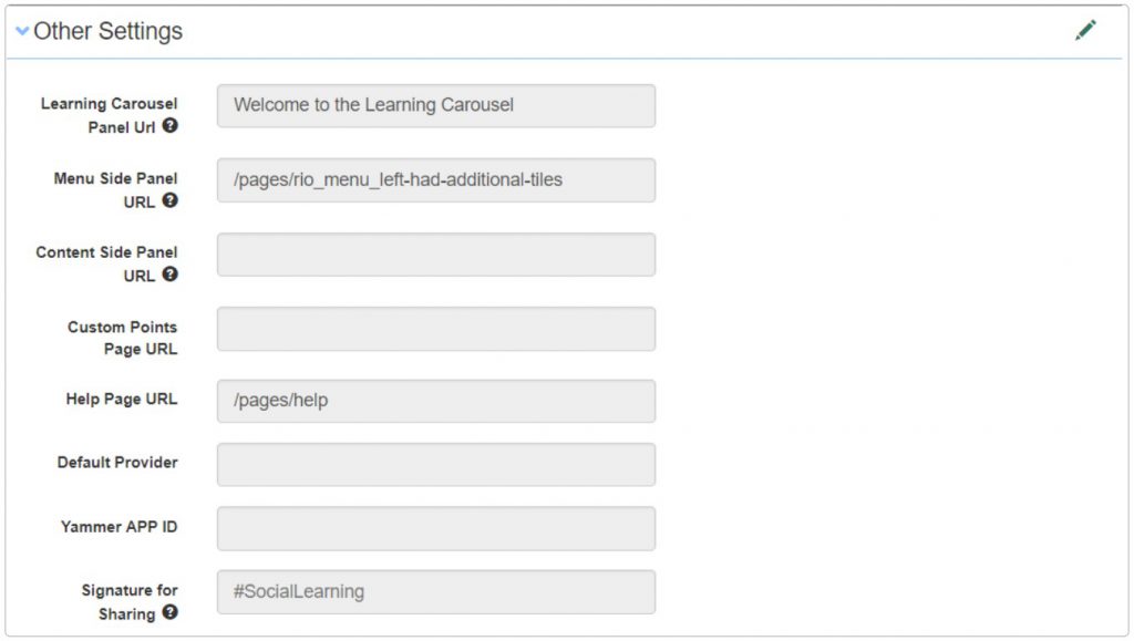 | Learning Carousel Panel URL | Text entered here will appear as text at the top of the Learning Carousel page |