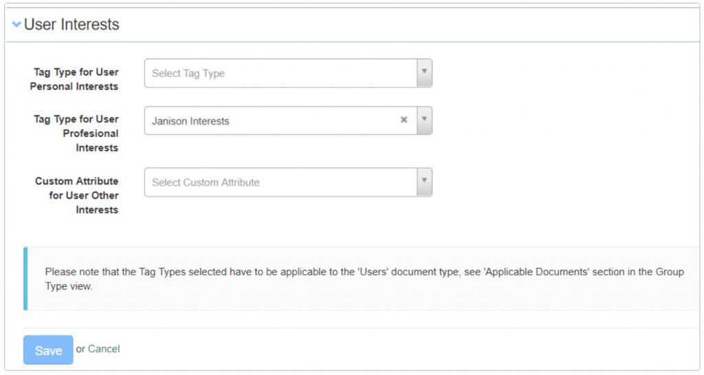User Interests is where you enable the required tags for Professional and Personal Interests. You must have your tags and tag types created prior to configuring this section.