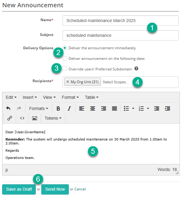 Tokens allow for dynamic content within announcements, such as personalised user information or authentication links. In the below example, we’ve selected the token User.GivenName, which personalises the message by inserting the recipient’s first name.