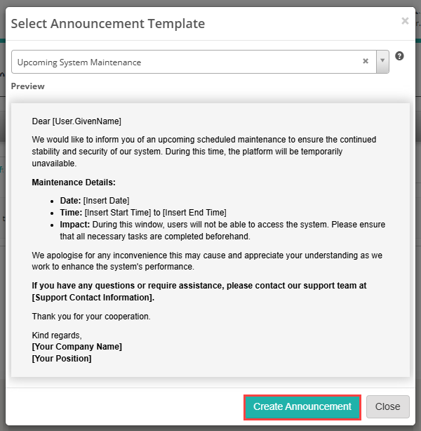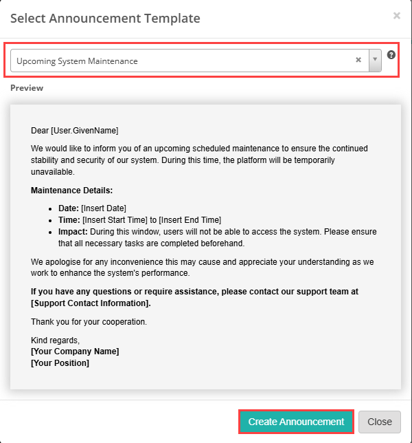 Templates allow for consistent messaging. They also save time and ensure accuracy by reusing pre-approved content. This reduces the need for manual entry and minimises the risk of errors or inconsistencies in announcements.