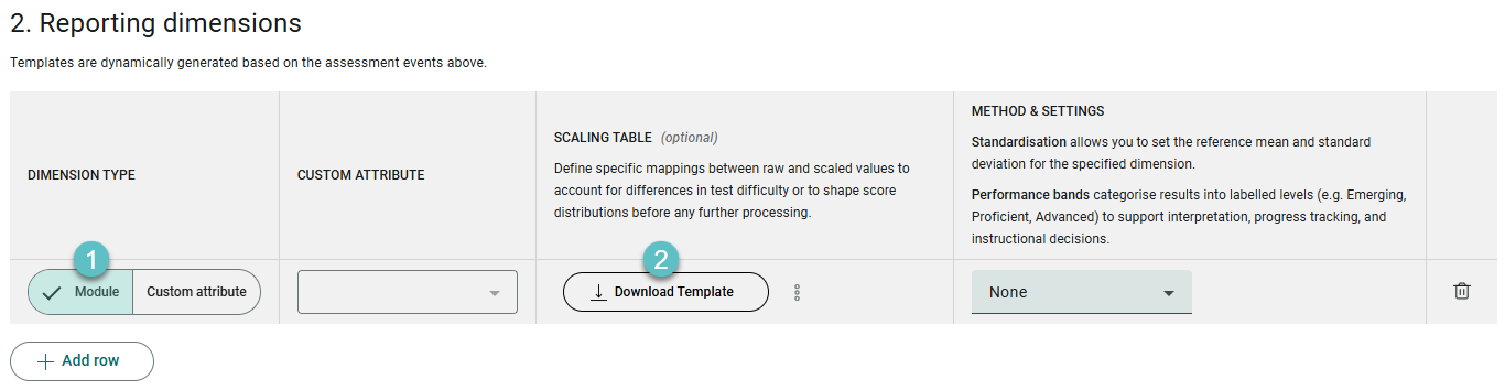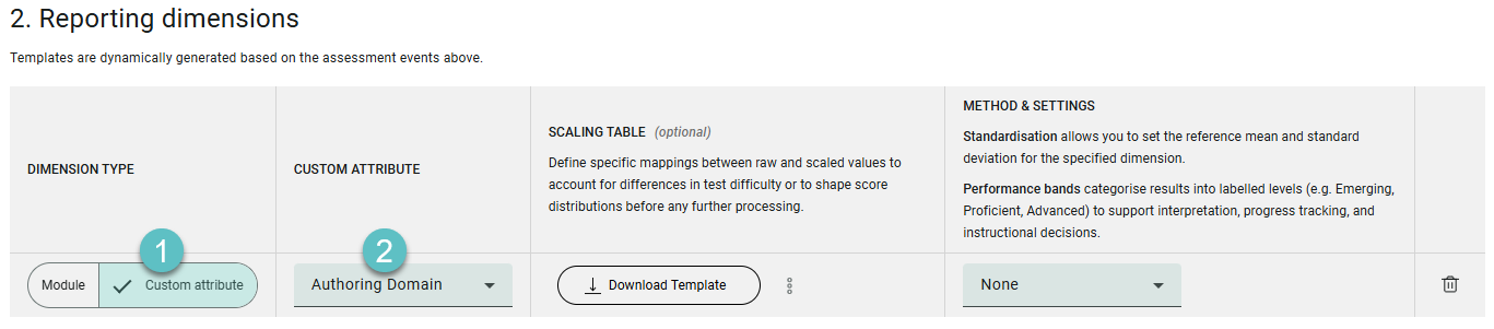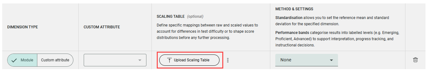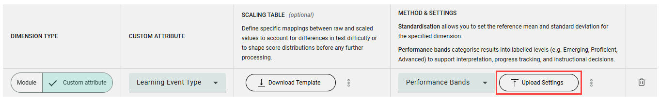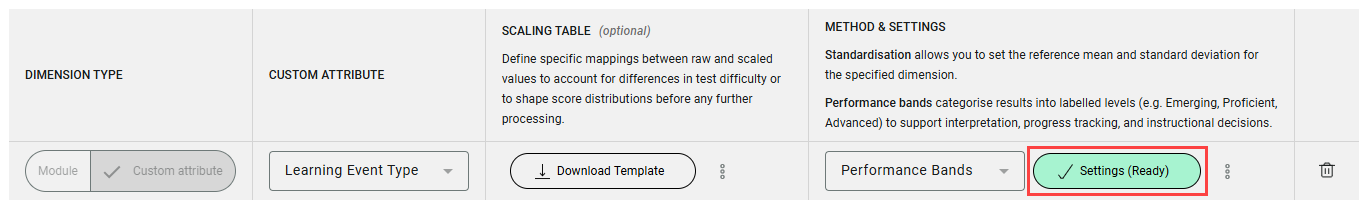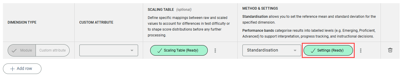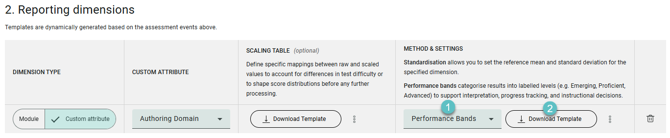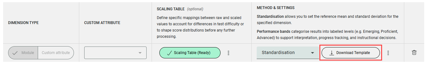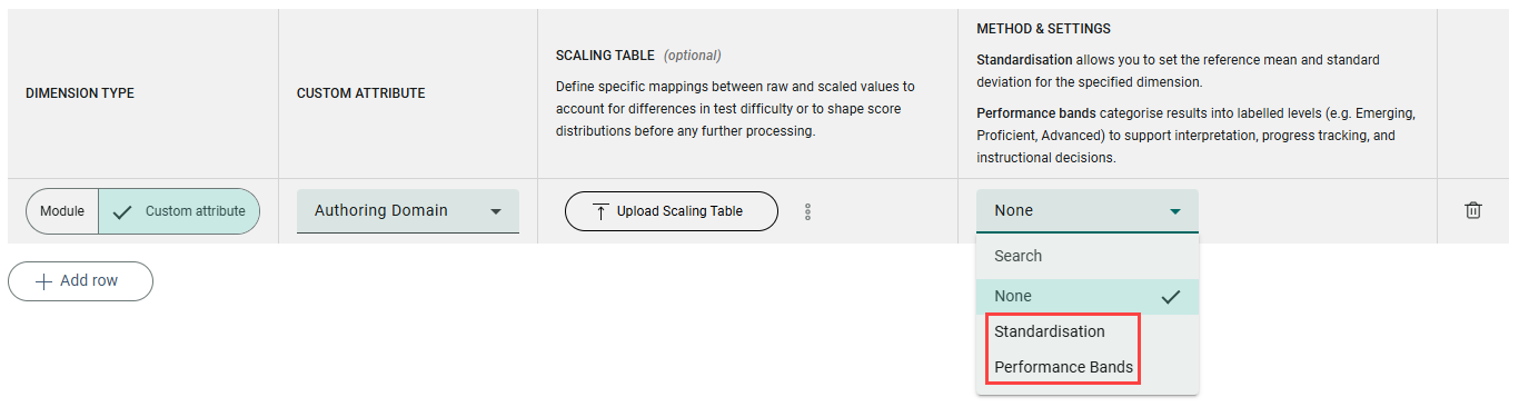 Standardisation allows you to set the reference mean and standard deviation for the specified dimension. Performance bands categorise results into labelled levels (e.g. Emerging, Proficient, Advanced) to support interpretation, progress tracking, and instructional decisions.