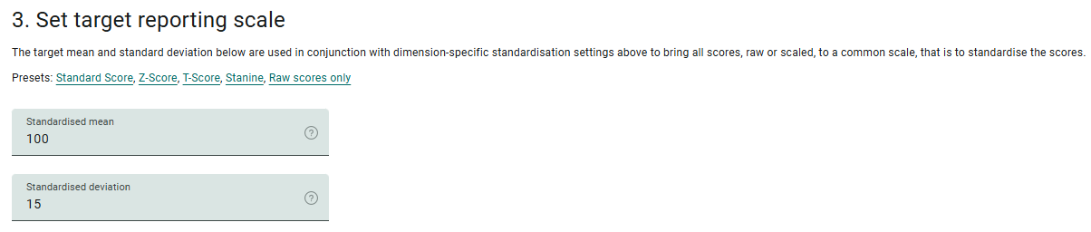 The target mean and standard deviation below are used in conjunction with the dimension-specific standardisation settings above to bring all scores—whether raw or scaled—onto a common scale. This process is known as standardisation.