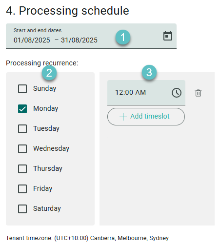 The processing schedule uses your tenant’s timezone, displayed at the bottom of the section (e.g. UTC+10:00 Canberra, Melbourne, Sydney).