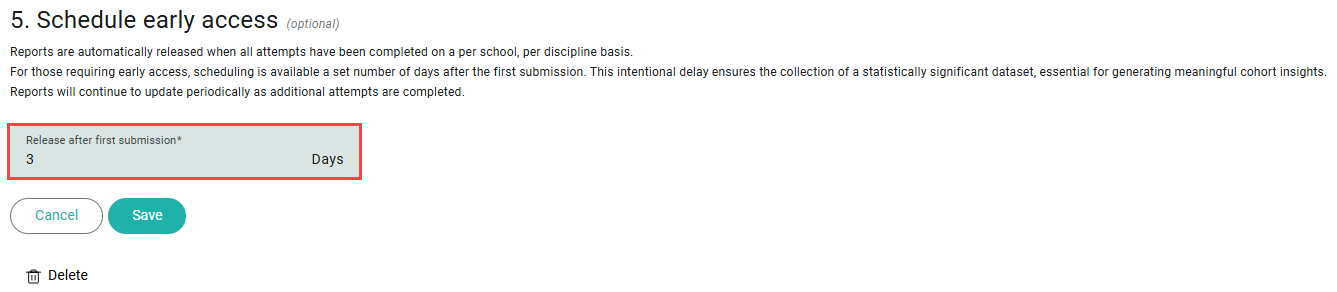 If early insights are required, you can schedule early access to reports. This allows reports to be released a set number of days after the first submission, rather than waiting for all students to complete the assessment.