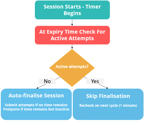 Auto-finalisation sets an expiry time on test sessions. When the set time is reached, the session is automatically finalised—but only if no active attempts are in progress.