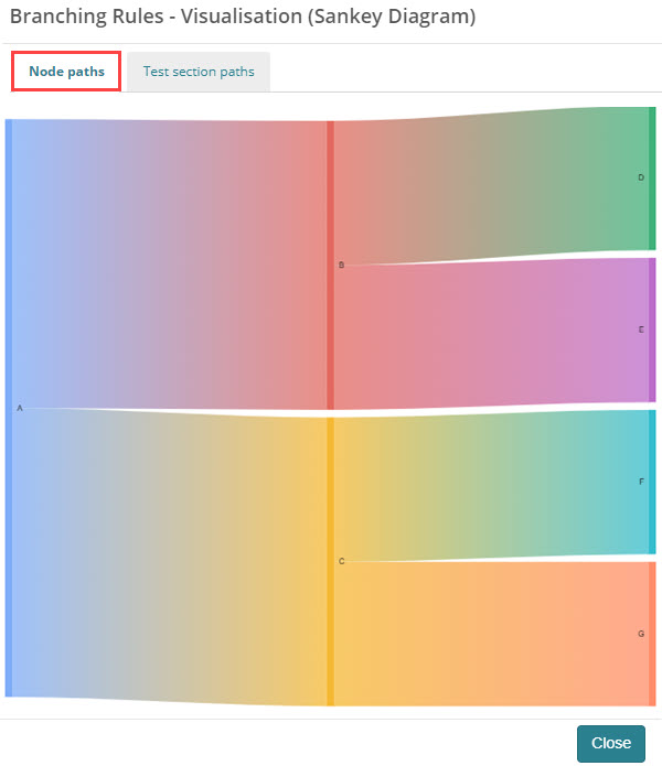 In the example below, all test-takers start with test section A. Each test-taker then takes one of four possible test paths; ABD, ABE, ACF or ACG. The path with the highest difficulty is ABD and the path with the lowest difficulty is ACG.