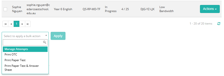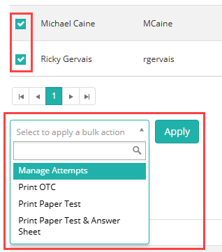 At the bottom of the Test-takers section, a bulk actions filter allows you to apply actions to multiple test-takers by selecting their checkboxes on the left, choosing an action, and then clicking Apply.