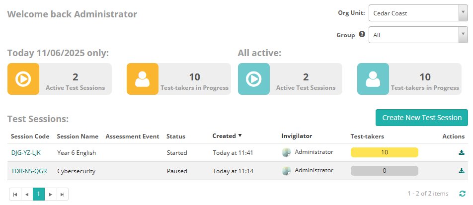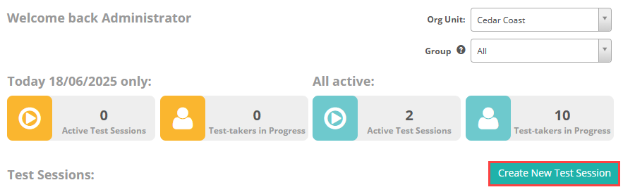 The Test Centre Dashboard, sometimes called the Invigilator Dashboard, provides a summary of information relating to your test delivery and gives you access to create sessions.