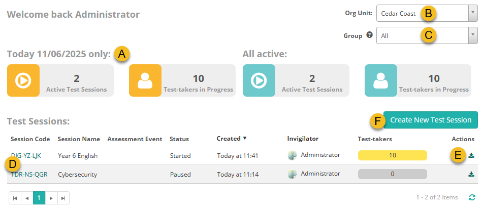 AThe tiles at the top of the dashboard provide a summary of the Active Sessions and Test-takers in Progress for the selected Org Unit and Group.