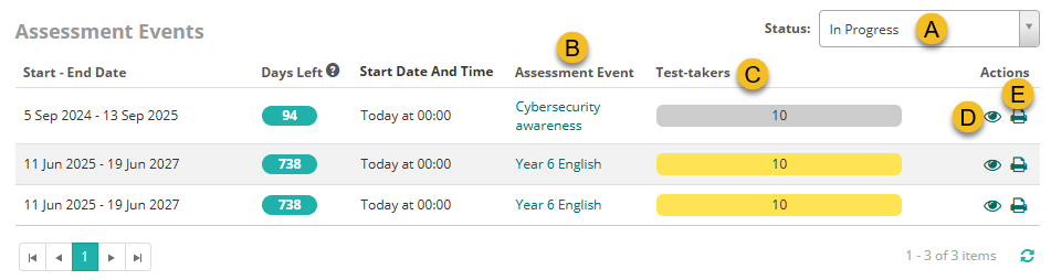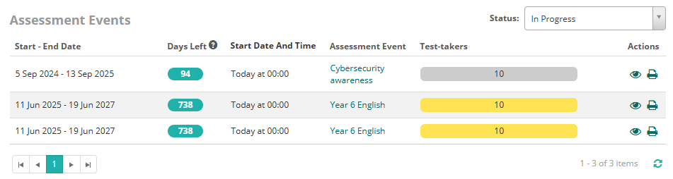 The Assessment Events section displays information about each of the assessment events and the progress of the candidates undertaking the event. You can sort the information by Start Date & Time by selecting the column header.