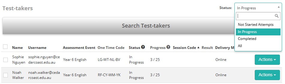 AStatus: Allows you to filter test-takers based on their current status. Available options include: