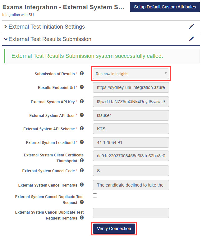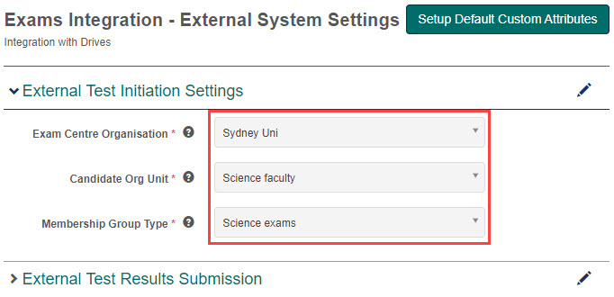 - On the Exams Integration – External System Settings screen, update the settings in the External Test Results Submission expandable section.