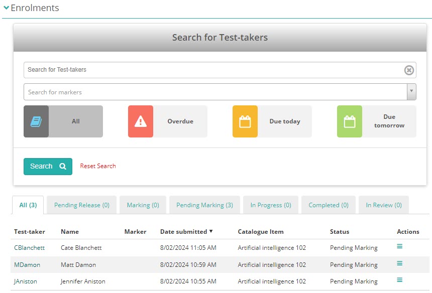 The Enrolments section displays a summary of the marking stats. From here you can: