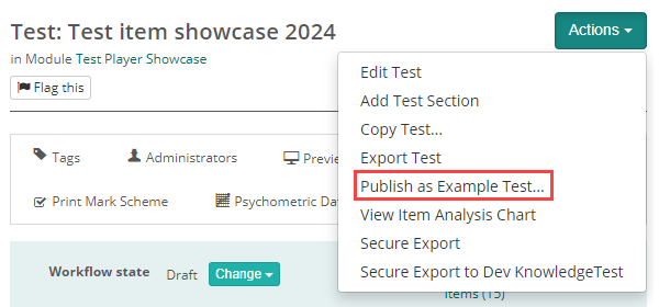 Open the required test and select Publish as Example Test from the Actions drop-down.