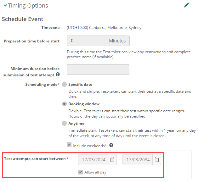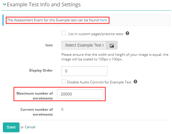 This section allows you to set the maximum number of enrolments. It also provides you with a link to the related assessment event that was auto-created when the test was published as an example test.