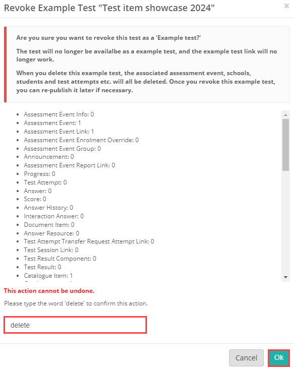 Open the required test and then from the Actions dropdown, select Revoke Example Test.