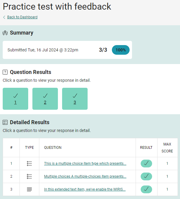 After selecting Finish to submit their test, the system directs them to the candidate feedback page. In the example below, the example test contains three items, multiple choice, multiple choices and an extended text item type.