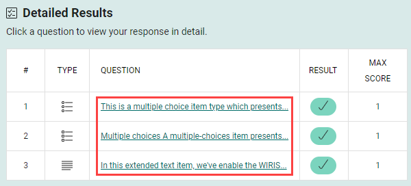 Test-takers open the item in the test player by selecting any of the QUESTION links.
