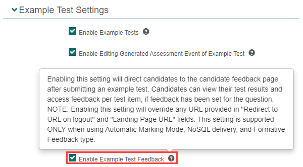 Enable Example Test Feedback – Enabling this setting will direct candidates to the candidate feedback page after submitting an example test. Candidates can view their test results and access feedback per test item, if feedback has been set for the question. NOTE: Enabling this setting will override any URL provided in “Redirect to URL on logout” and “Landing Page URL” fields. This setting is supported ONLY when using Automatic Marking Mode, NoSQL delivery, and Formative Feedback type.