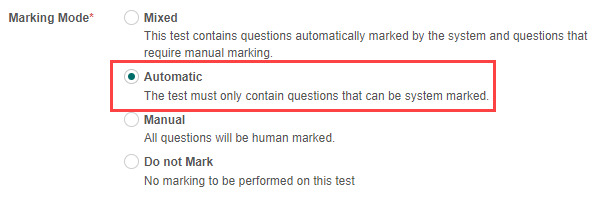 For automatic or system marked items, the system will assign and display the set marks for the item depending on the test-taker response. For manual or human marked items, the full marks set for the item will be assigned and displayed to the test-taker, provided they have entered a response. If the test-taker has not provided a response, a zero mark will be assigned and displayed for the item, and a failure will apply.