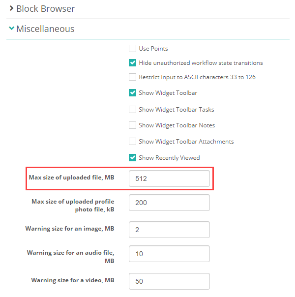 To set this limit, go to Settings > Tenant Settings, then expand the Miscellaneous section. Enter a value in the Max size of uploaded file (MB) field.