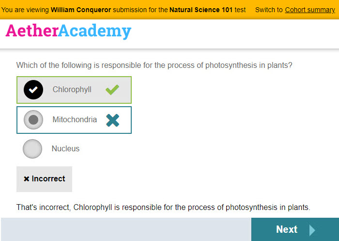 When viewing the item and attempt, an orange bar displays at the top of the screen with test-taker and test details.