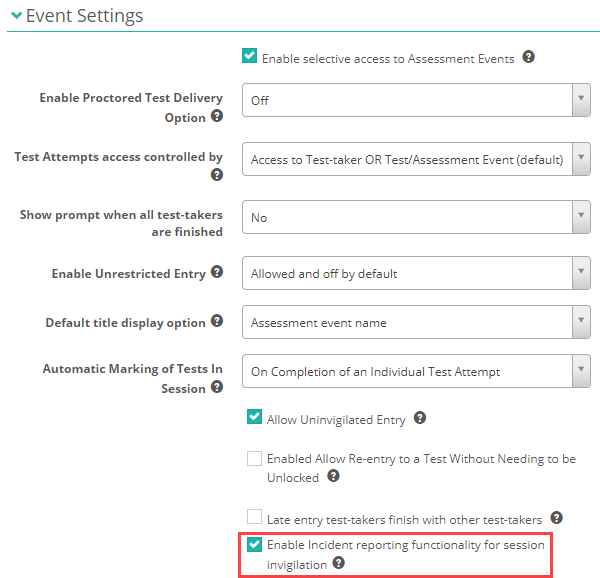 To activate the incident reporting feature, navigate to Settings > Assessment Event Settings and expand Event Settings.