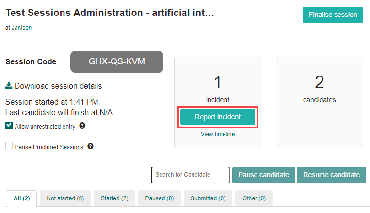 Incident reporting allows invigilators to document incidents that occur during a test session, such as a test-taker experiencing technical issues or falling ill. Invigilators can report incidents directly from the test session administration dashboard.