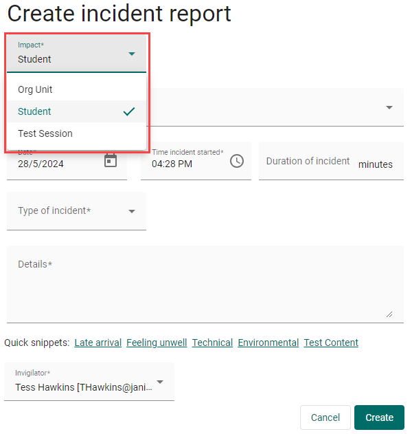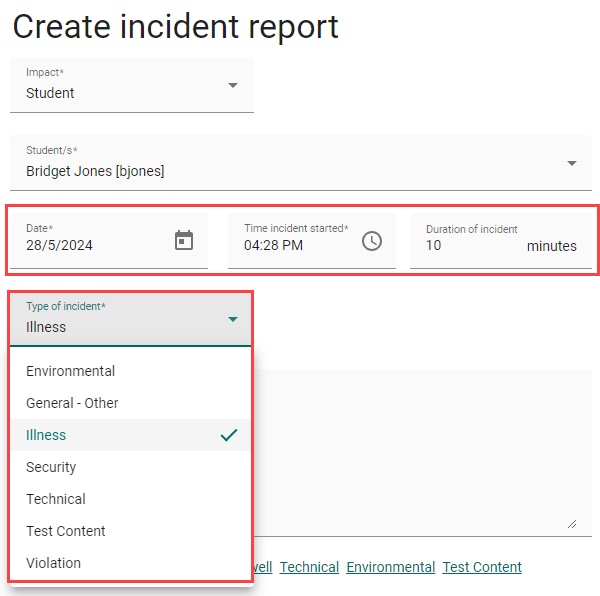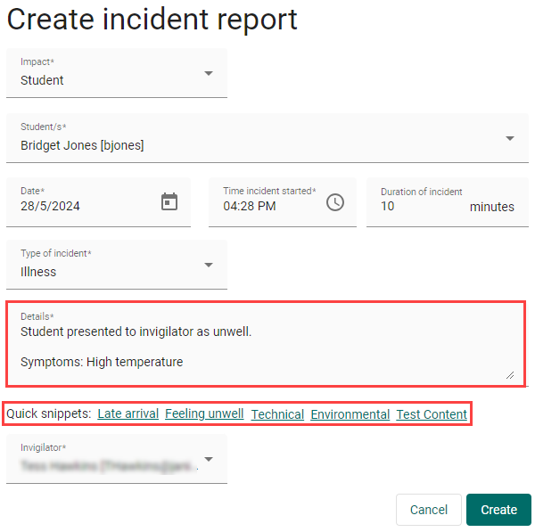 Quick snippets are templates containing text prompts relevant to the incident type. These templates are a great guide for invigilators to efficiently create reports and ensure they are providing the necessary details. The available Quick snippet types include; Illness, Late arrival, Technical, Test content, and Environment.