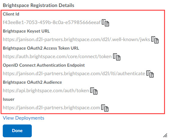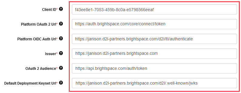 For this step, you will need the six Brightspace Registration Details values you copied and saved when setting up the integration in Brightspace. Refer to the Register an LTI tool step in Brightspace setup above for more details.