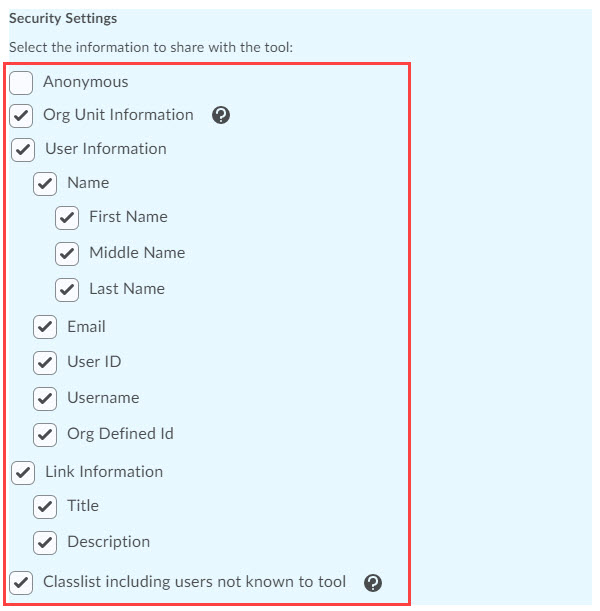 - When this is checked, the Institution Role mapping from the IMS Configuration is included in the launch. Users Context Role will be included, unless the security setting at the deployment is set to ‘anonymous’.