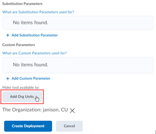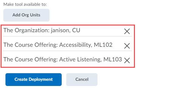 - The Add Org Unit screen closes and the selected courses are listed on the Deploy Tool screen under Make tool available to:.