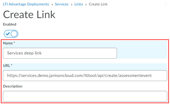 The data shown in the images below provides an example of what to enter into Brightspace. When configuring Brightspace to integrate with Janison Insights, you will need to enter the correct details for your organisation.