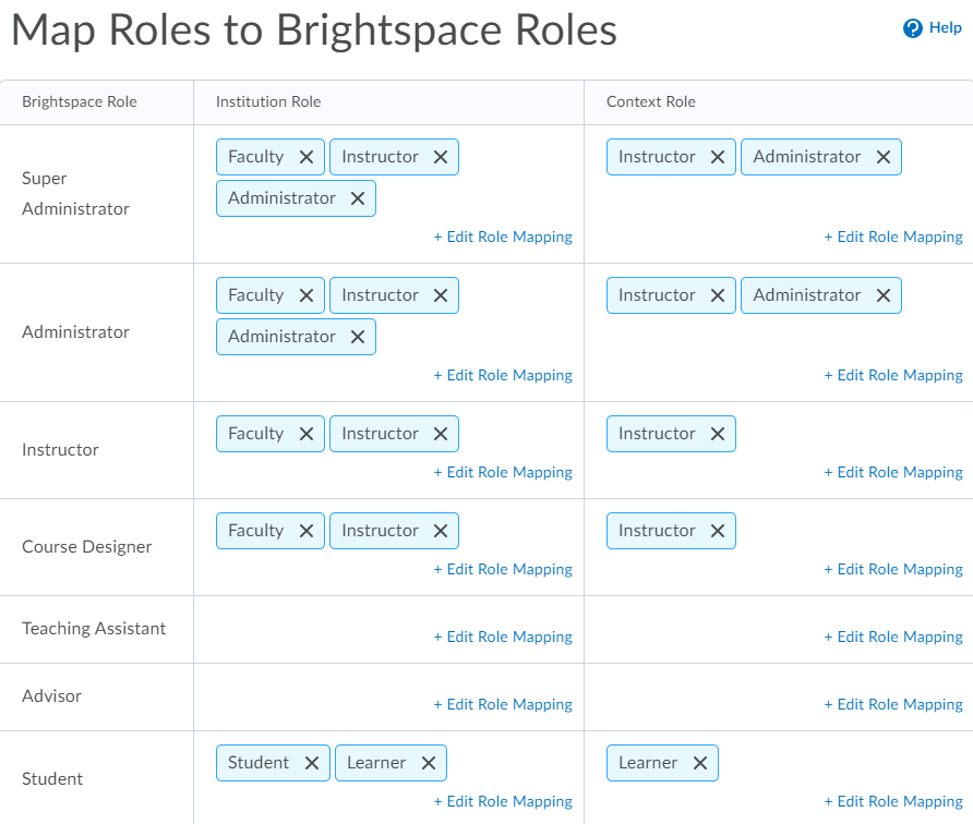 IMS mappings allow custom roles in learning systems to be mapped to the IMS definition of standard role types. Defining these will ensure Janison Insights recognises the Brightspace users and their roles.