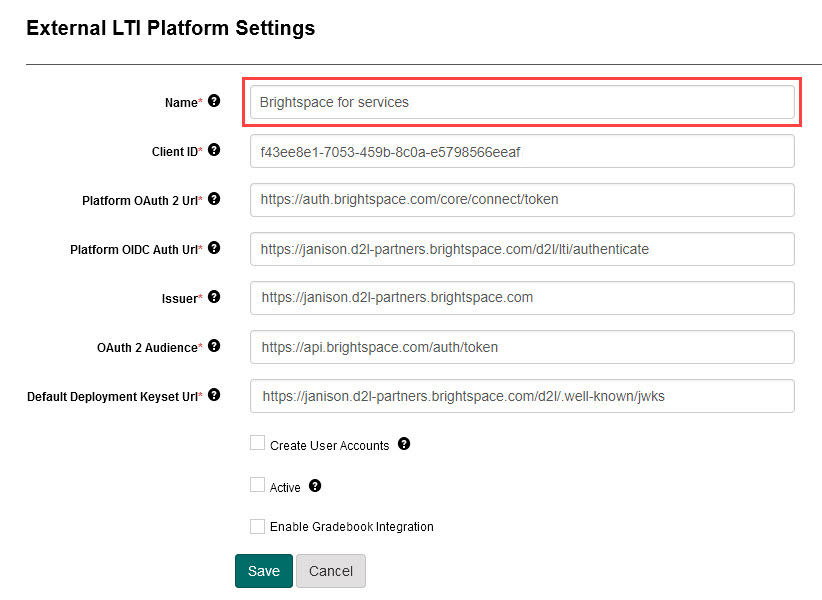 - The External LTI Platform Settings screen with editable form displays. Complete the following steps: